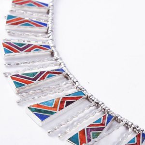 Silver pendant 950 with inlaid chrysocolla, spondylus, abalone, mother-of-pearl and spondylus. Its design is inspired by the sacred mantles worn by priests in sacred rites.