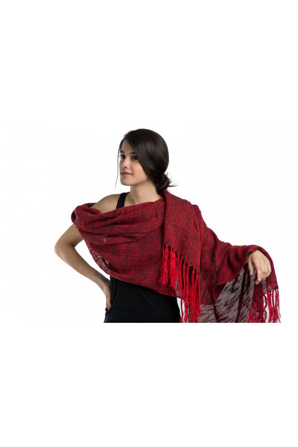 Resists changing trends as for its simplicity and colorful enable this addition will use in all seasons. A basic with character. Fabric construction taffeta, red warp and flamed wool alpaca rayon black on the plot, with hand knotted fringes. This unique artisan piece is made in a textile workshop Artelar handloom heddle low by Estibaliz Saenz de Urturi.
